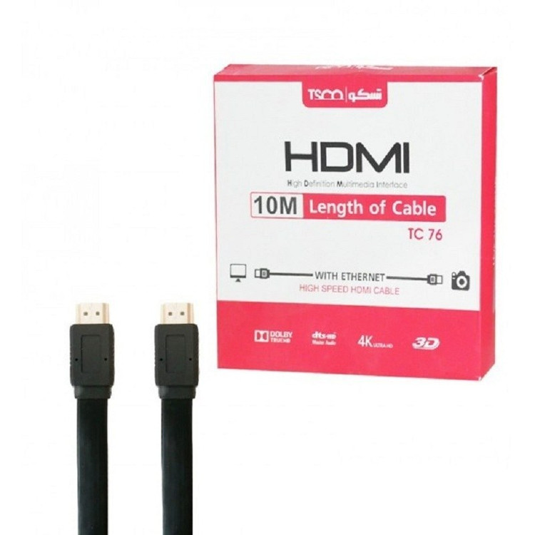 کابل HDMI تسکو مدل TSCO TC 76 کابلی به طول 10متر می باشد که ازکیفیت ساخت مطلوب، پشتیبانی بالای تصاویر و ظاهر فلت خوبی برخوردار است . کابل HDMI قابلیت پشتیبانی از تصاویری با رزولوشن 4K و 3D را نیز دارد . این کابل دارای کانکتورهایی با روکش طلا برای مقاومت بیشتر می باشد ، این روکش توانایی این را دارد تا نویز را به کمترین حد ممکن برساند و عملا کابل HDMI ضد نویز را به ما تحویل دهد که این قابلیت ضد نویز بودن آن باعث افزایش سرعت انتقال می شود و این کابل قابلیت اشتراک شبکه را نیز دارد . HDMI نوعي پورت ارتباطی می باشد كه قابليت انتقال تصوير و صدا با كيفيت بالا را تنها با استفاده از يك كابل به كاربران ارائه ميدهد همچنین از این کابل برای برقراری ارتباط بین دستگاه های دیجیتال زیادی مانند تلویزیون ، گیرنده دیجیتال ، لپ تاپ ، دوربین عکاسی ، کنسول های بازی و ... استفاده می شود و برای زمانیکه بخواهیم محل قرار گیری دستگاه ها را تغییر دهیم . از دیگر مزیت های این کابل ، طول بسیار زیاد آن است . این کابل قابلیت انتقال صدای دالبی (قدرت ، وضوح و واقع گرایی صدا) را دارا می باشد .