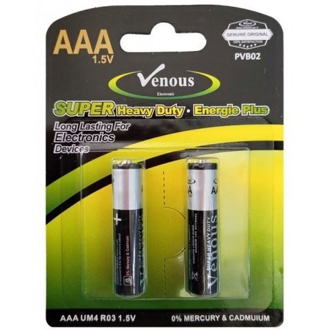 یک نوع باتری نیم قلمی از نوع (AAA) است، که توسط شرکت ونوس در بسته 2 عددی به بازار لوازم و تجهیزات برقی و الکترونیکی عرضه شده است و با کیفیت عالی به فروش می رسد. ولتاژ اسمی تولیدی این باتری ها 1.5 ولت است و در اسباب بازی ها، دستگاه های کوچک خانگی مانند ریش تراش و کنترل تلویزیون و.. استفاده میشوند. باتری نیم قلمی ونوس مدل Super Heavy Duty دارای ماندگاری طولانی است و تا مدت ها می توان از آن استفاده کرد.