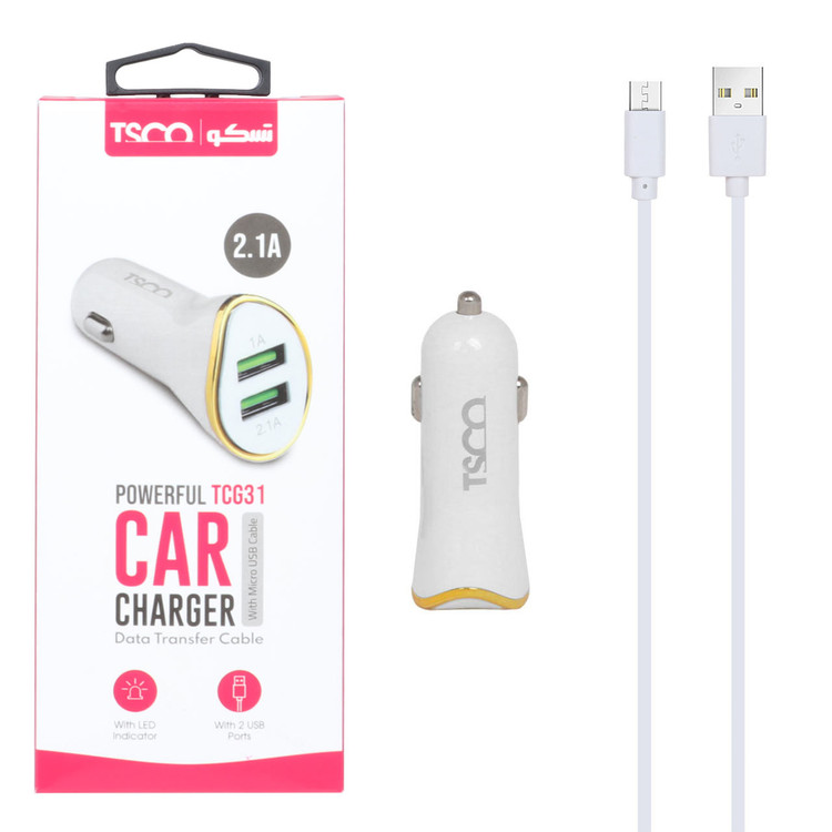 شارژر فندکی « تسکو » با درگاههای فندکی خودروهای مختلف سازگاری دارد. روی سطح این شارژر دو درگاه خروجی USB طراحی شده که شدت جریان خروجی آنها برابر با 2.1 و 1 آمپر است؛ به این ترتیب برای شارژ کردن باتری دو دستگاه مختلف مانند گوشی موبایل، دوربین دیجیتال، تبلت و دیگر لوازم از این قبیل به طور همزمان مناسب است. شارژر فندکی TCG 31 قابلیت شارژ سریع دارد. ولتاژ ورودی در این محصول 12 تا 24 ولت بوده و ولتاژ خروجی در آن 5 ولت است. این شارژر 18.2 گرم وزن دارد و ابعاد آن 25 × 35 × 70 میلیمتر هستند. برای استفاده از این شارژر کافی است آن را به طور مستقیم به درگاه فندک داخل خودرو متصل کنید و با استفاده از LED تعبیه شده روی آن وضعیت شارژر را مشاهده کنید. همراه با این شارژر یک کابل microUSB ارائه میشود که طول آن برابر با یک متر است. روکش این کابل بافته شده که در مقابل گره خوردن و در هم پیچیدن مقاوم است.