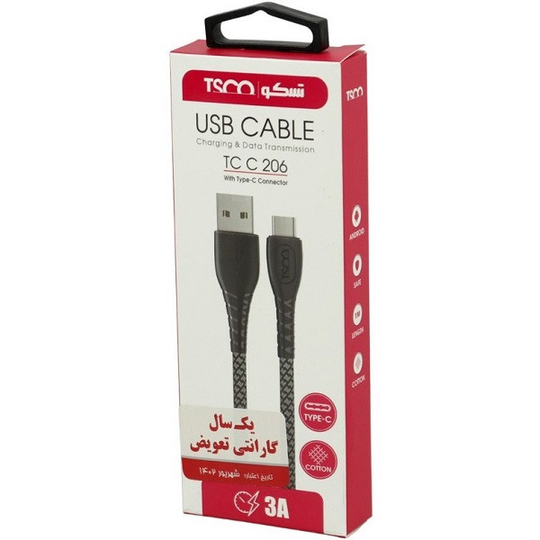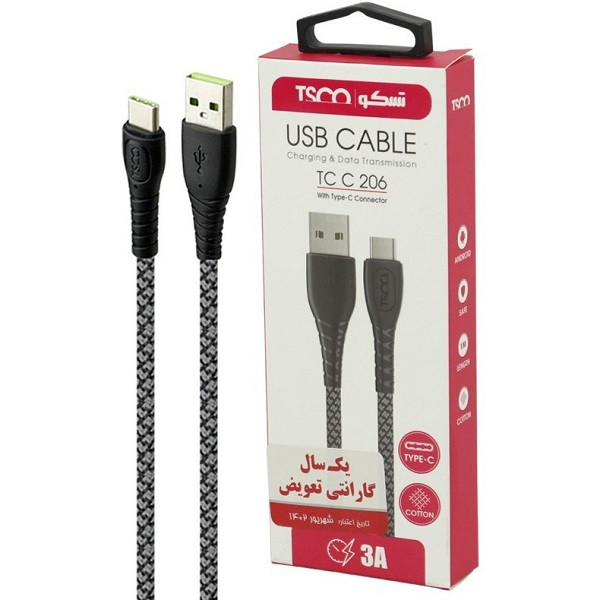 کابل تبدیل تسکو مدل TC C206 با طول 1 متر یکی از بهترین کابل های ارایه شده می باشد. جنس این کابل از نوع کتان و مقاوم در برابر پارگی است و همچنین این ویژگی باعث می شود که از گره خوردن سیم جلوگیری کند. این کابل از یک طرف کانکتور USB دارد و از طرف دیگر به یک کانکتور Type-C ختم میشود. شدت جریان عبوری حداکثر3 آمپر می باشد و مقاومت در برابر نوسانات ولتاژ و جریان برق را دارد. از کابل تسکو TC C206 میتوان برای انتقال اطلاعاتی نظیر فیلم، موسیقی، عکس، فایل زیپ و سایر فایلها استفاده کرد.