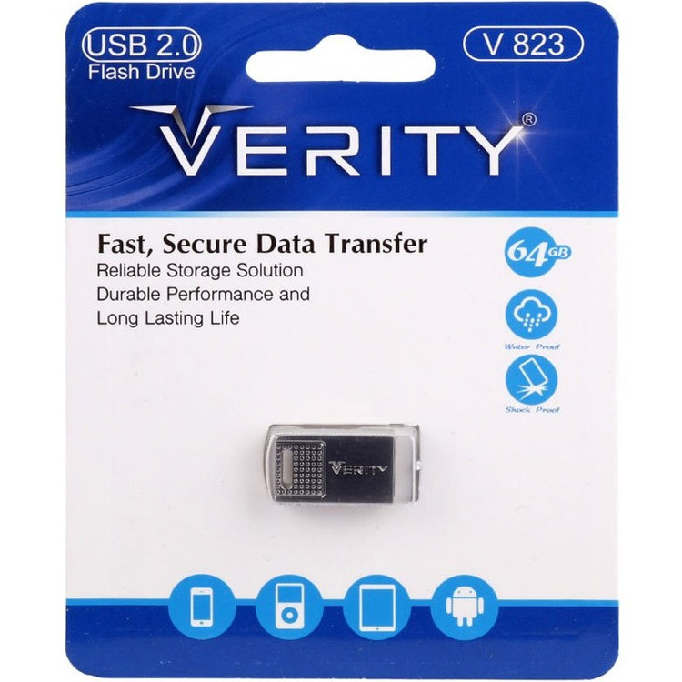 فلش مموری 64گیگ VERITY مدل V-823 دارای اندازه کوچک و سبک می باشد. این فلش دارای بدنه ای فلزی می باشد که در قسمت بالایی فلش شیاری طراحی شده است که بتوانید از آن برای اتصال بند به جا کلیدی استفاده کنید و مانع از گم شدن فلش مموری شوید. فلش مموری V823 با درگاه USB 2.0 از سرعت مناسبی برای نمایش و انتقال اطلاعات میان سیستم ها، تماشای فیلم در نمایشگر ها، گوش دادن به موسیقی در پلیرها و … بهره می برد و می توان از آن در تمامی سیستم عامل های ویندوز و مک که دارای درگاه USB باشند استفاده کنید.