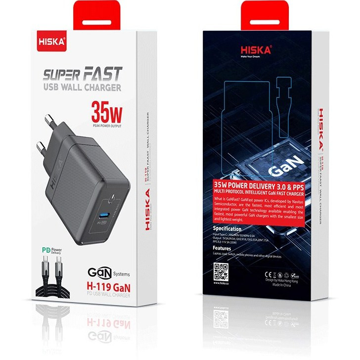 شارژر دیواری 35 واتی هیسکا مدل H-119GaN دارای یک درگاه خروجی USB-C است . این درگاه از فناوری Power Delivery 3.0 پشتیبانی میکند و میتواند دستگاههای مختلف را با سرعت بالا شارژ کند . توان خروجی کلی این شارژر 35 وات و شدت جریان خروجی آن 3 آمپر می باشد که برای شارژ سریع دستگاههای مختلف کافی است . شارژر دیواری 35 واتی هیسکا مدل H-119GaN برای شارژ دستگاههای مختلفی مانند گوشیهای هوشمند ، تبلتها ، دوربینهای دیجیتال ، اسپیکرها و… مناسب می باشد . همچنین ، دارای استانداردهای FCC ، CE و RoHS است . این استانداردها نشاندهنده کیفیت و ایمنی این شارژر هستند . شارژر دیواری 35 واتی هیسکا مدل H-119GaN دارای کابل همراه Type-C به Type-C می باشد .
