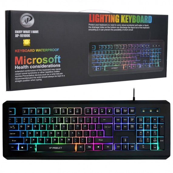 یک مدل بسیار با کیفیت است که نحوه اتصال آن با سیم از طریق کابل متصل با رابط USB به طول تقریبی 140 سانتی متر با روکش پلاستیک است و بدنه ساخته شده از جنس پلاستیک مقاوم در برابر فشار و ضربه، دارای طول عمر 5 میلیون بار کلیک میباشد که مقدار بسیار فوقالعاده ای میباشد. این کیبورد دارای طراحی ارگونومیک جهت جلوگیری از خستگی دست میباشد و ، مقاوم در برابر نفوذ آب به داخل کیبورد است و برخوردار از 104 عدد کلید فیزیکی و حروف فارسی حک شده، با کلید های مولتی مدیا و FN میباشد کیبورد گیمینگ XP-Product XP-10100 دارای پس زمینه با نورپردازی RGB جهت ایجاد جلوه بصری زیبا در مکان های کم نور و تاریک است و موفق به کسب استاندارد های ایمنی و سلامت محصول شامل CE/ FCC/ RoHS شده است.