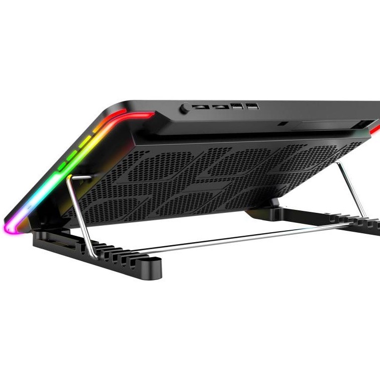 وجود شش فن قدرتمند با سرعت 2200 دور در دقیقه باعث توزیع یکنواخت جریان هوا در زیر لپتاپ میشود. بدنه ترکیبی از ABS و فلز، استحکام بالا و دفع بهتر حرارت را تضمین میکند. نورپردازی RGB با 12 حالت مختلف جلوهای حرفهای و گیمینگ به میز کار شما میدهد.
