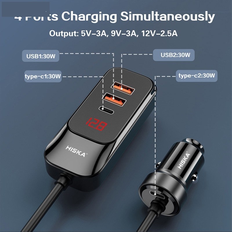 شارژر فندکی 120 وات هیسکا مدل HCC-327 | 4 پورت PD/QC + نمایشگر ولتاژ + کابل 1.5m