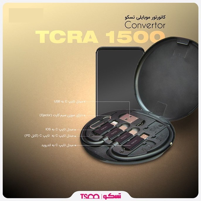 سته‌بندی کابل تبدیل تسکو مدل TCRA 1500 با سوزن سیم کارت و محل نگهداری رم